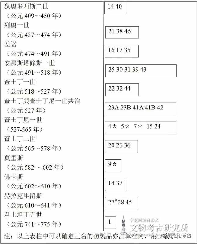 全部十個發行所符記都有,當然有的缺乏實物觀察,可能有誤判,儘管這樣,也可以肯定地說,絕大部分發行所符記都在流入中國的拜占庭金幣上出現,這是觀察幣面銘文取得的一個重要結果。