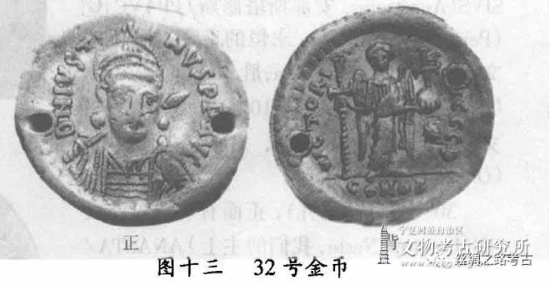 32號金幣(图十三),正面銘文DN(Dominus Noster,我們的主上)IVST I/NVS(Justin,查士丁)PPSVG(Perpetuus Augustus,永恆的皇帝),背面Victori/囗(Victoria,勝利)囗囗GGG(Auggg,皇帝們),B,即第2發行所標記。中央CON(Constantinople,君士坦丁堡)OB(obryzum,印記)81。