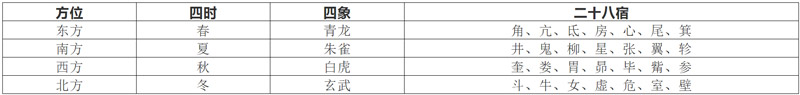 《淮南子·天文训》、《史记·天官书》对此都有比较详细的叙述。《论衡》卷三《物势篇》称“东方,木也,其星仓龙也;西方,金也,其星白虎也;南方,火也,其星朱鸟也;北方,水也,其星玄武也。”朱鸟也就是朱雀。这种安排反映了当时人的宇宙图式观念(cosmological)。