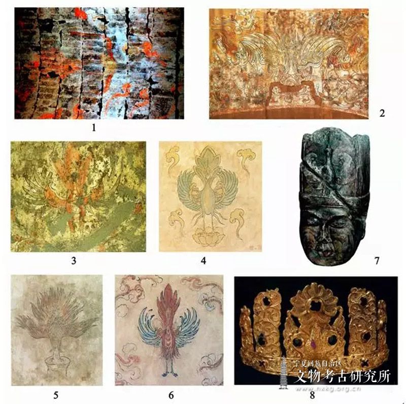 1:西安理工大学汉壁画朱雀图 2:茹茹公主墓朱雀图 3:固原唐史索岩夫妇墓过洞朱雀壁画 4:唐苏思勖墓室南壁朱雀图 5:唐韦氏墓室南壁朱雀图 6:唐高元珪墓室南壁朱雀图 7:阙特勤头像 8:毗伽可汗王冠