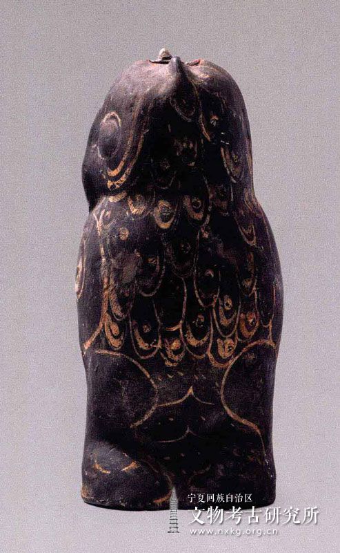 鸮,是猫头鹰一类的鸟,据古代传说,鸮是“阴间”的一种神鸟。该陶鸮呈站立状,翅尾下垂,全身为灰黑色,两眼圆睁,用白色点绘出肢爪翅羽,不仅给予了合理的艺术夸张,更给人以炯炯有神、高度警惕的感觉。头顶有一圆孔。器壁厚薄均匀,显示了西汉时期宁夏地区手工制陶业的发展水平。