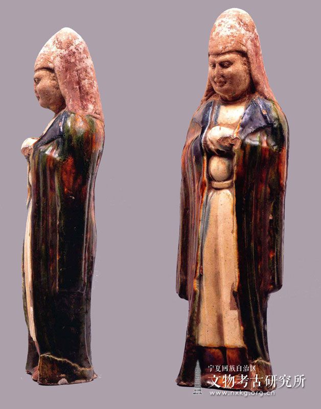 为了增强写实效果,三彩人物俑的头部多不施釉,仅涂以白粉,在唇和面颊饰朱红,眼、眉、须、发、冠多用墨线描绘。该俑头戴圆顶风帽,内穿圆领长袍,腰束带,外穿翻领长大衣,拖至地表,足登圆头靴。面相丰满,眉骨高凸,双目微垂,鼻翼宽阔。双手拱于胸前。头部无釉,主要用褐彩、红彩对风帽、唇部进行装饰勾画。体施白釉、蓝釉、绿釉和黄褐釉等。唐三彩的鈷蓝是中国最早运用鈷土矿作陶瓷彩料的实物例证。这件俑有蓝釉出现,更显珍贵。