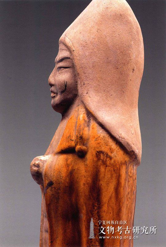 该俑头戴圆顶风帽,内穿圆领长袍,腰束带,外穿翻领大衣,下着长裤,足登圆头鞋。面相丰满,眉骨高凸,双目细长,鼻冀宽阔,唇上、下满布胡须,唇角两撇八字胡须上卷外翘,富于动感。双手拱于胸前。面部无釉,主要以红彩、黑彩对风帽、面部、五官进行简单勾画。体施自釉和黄褐釉,釉色光亮。