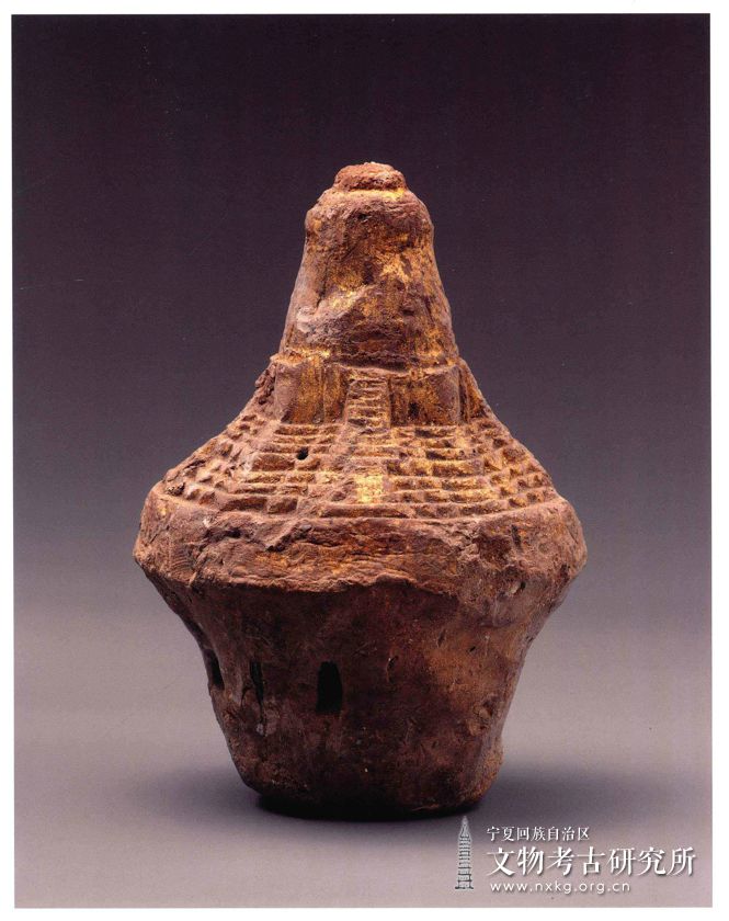 1987年宁夏青铜峡市一百零八塔出土 呈佛塔状。下半部较粗矮,为手工制作。上半部脱模,脱模的纹饰是四层小塔,其下有一周梵文。大的一件有描金。