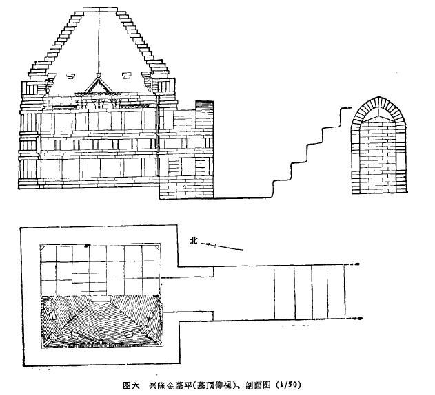 此墓是一座仿木构建筑的砖室墓,墓内积满淤土,墓室平面近方形,东西长又、南北宽17米。墓门为券洞式,开在墓室南端,墓向168度。门洞长88、宽58、门内高155厘米,砌成拱券形。封门坚固,用条砖平卧错缝砌法。墓道前端近墓门处约l米长的一段较为平缓,其后向上作阶梯,一般每级高30、宽25厘米。墓底距墓顶高2.8米(图六)。墓室用长方形和正方形砖砌成。施工时,砖的压砌内施稀泥粘合,表面光洁。外露面用砖单表,其内部则附砖加固。墓室保存完好,仅在北壁歇山屋檐下的板门处有一盗洞。