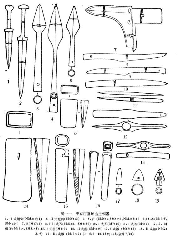 于家庄墓地出土的I式刀,背与柄无明显界线,和桃红巴拉所出相同。桃红巴拉墓葬的时代报告定在春秋晚期,于家庄I式刀的时代也应定在此时。