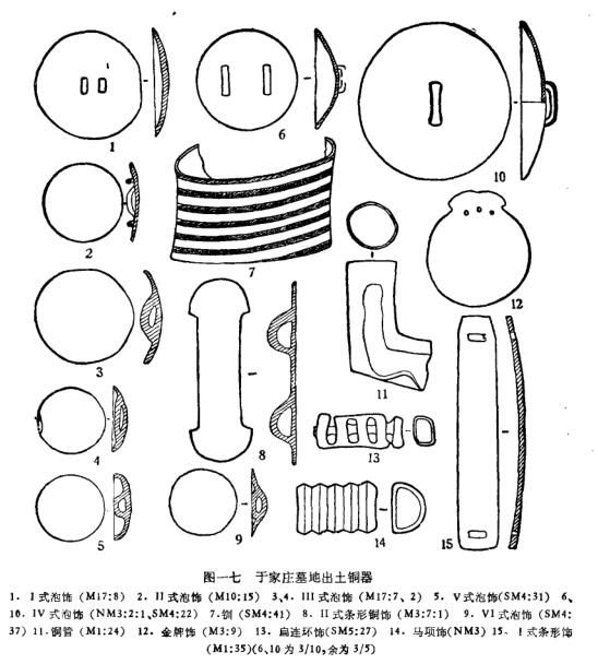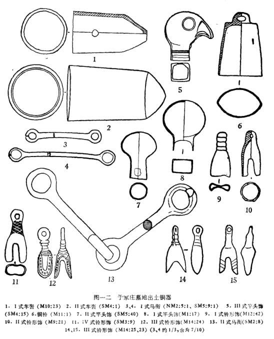 还需要指出的是,于家庄墓地与太行山以北、燕山周围地区的所谓山戎文化也有许多相似的也方。除了表现在殉牲的习俗外,还表现在许多器物的相似。如两地都有相近的戈、短剑、刀、锥、凿、斧、带扣、铃饰等器物[16]。当然,它们之间的差异同样明显,显然是不同部族文化的反映。