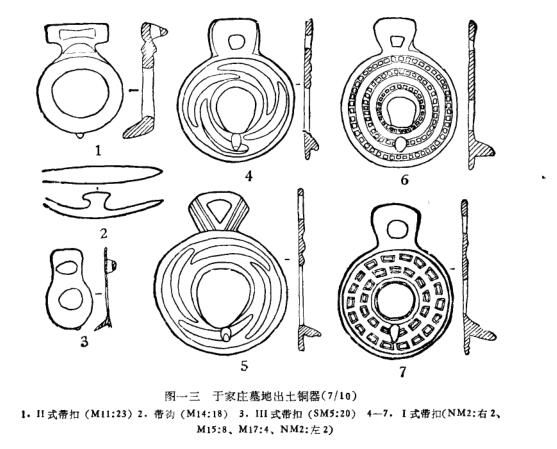 青铜带扣,于家庄的I式与毛庆沟的I、Ⅱ式相同,和桃红巴拉所出也相同,据此,该式带扣时代应为春秋晚期。