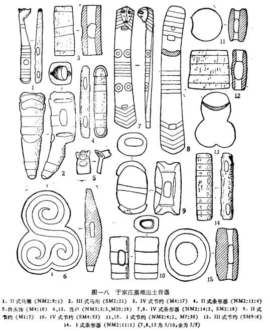 I式:2件。器形略呈腰鼓状,中部有对穿的圆形孔,一端封闭,有二道剔刻的冬带纹,另一端有孔与中部的圆孔互通。NMZ:8:l,长,.2、径2.9厘米(图一九,2;3图版拾捌,6)。