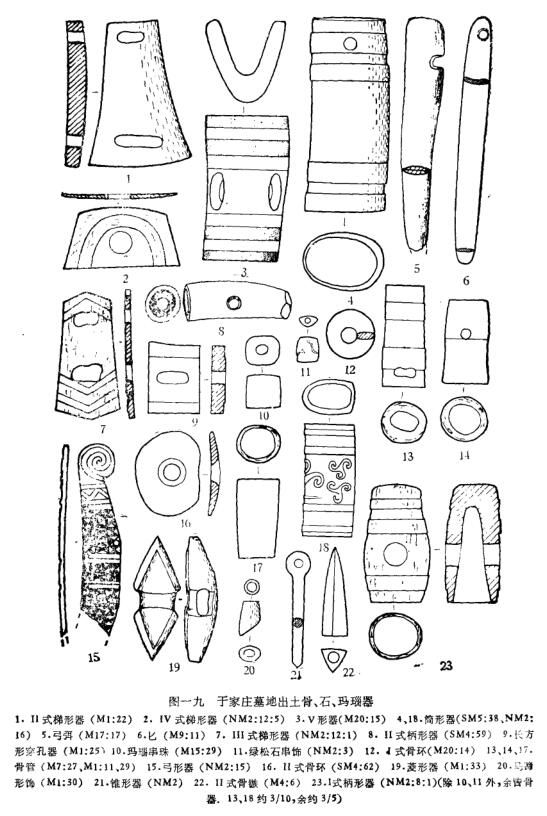 于家庄墓地与内蒙古鄂尔多斯地区的青铜文化相比,它们之间则表现出了更多的相近性。两地都盛行殉牲的习俗,随葬器物组合中,都有相同的青铜短剑、刀、带扣、双鸟形饰牌、环饰、铜管、兽头饰等。但是它们之间的差异性也明显存在。首先表现在墓葬形制上。鄂尔多斯地区的青铜文化墓葬均是土坑竖穴墓,未见土洞墓。在随葬器物上,于家庄墓地所出的矛不见于鄂尔多斯地区。骨器制造业的发达及各种骨制品之多,也是鄂尔多斯地区所不能比拟的。而鄂尔多斯地区的陶器,除单耳罐可作比较外,其他器形则未见于于家庄墓地。这种明显的差异,是难以将于家庄墓地纳入鄂尔多斯青铜文化模式之内的重要根据。
