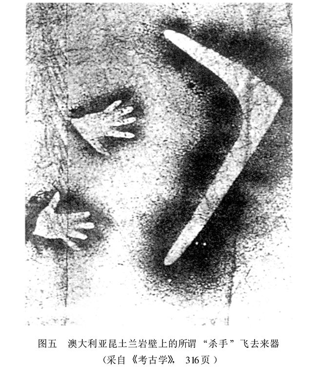 飞去来器是人类天才创造的结果,加上一个短曲可以飞行更远,轻松地飞出五、六十米。在空中旋转飞行中突然改变方向,即使没有击中预定目标则可回转原地,大大地降低了使用成本。在澳大利亚昆士兰中部的砂岩岩壁上,就发现V字形“杀手”飞去来器,这是关于这件武器图案的复原图(图五)⑨。美洲的印第安人、印度中部达逻毗荼部落都有类似飞去来器。古埃及的飞去来器据说是用来狩猎水鸟的,并有巫术的含义。当然,飞去来器存在于现代部族中人们最熟知的还是澳大利亚。