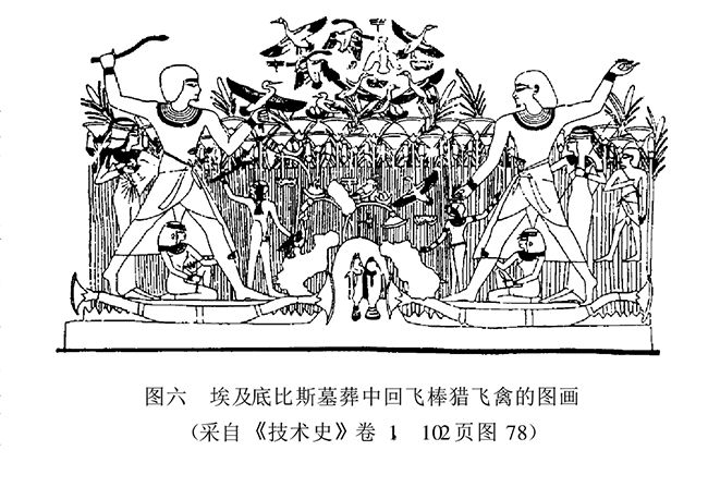 澳洲发现的飞去来器,最初人们以为是狩猎袋鼠等动物的工具。随着了解地深入,飞去来器的性能逐渐地被认识到,如果飞行太高就不能击中目标,太小或太轻则对大型的动物袋鼠之类,根本不具备杀伤力。按照人们已经了解的发射角度和飞行原理,飞去来器是要站在顺风的地方投掷。投掷时正确的方法是竖向发射,它在气流中旋转着飞向目标,并在风的作用下急剧转弯,回到身边。飞行原理非常复杂,通过自身旋转产生升力,利用自己特殊的形状来改变方向,这种空气动力学原理使专业物理学家都深感困惑,他们无法简单地预料结果。因为,在飞行中有两种运动,不但在空中飞翔,自身还在不停地旋转,飞行中具有空间高度是其必须具备条件之一。它在捕猎方面的功能明显地受到局限,土著人利用飞去来器猎捕袋鼠等大型动物,被认为是一种虚构。事实上,飞去来器仅仅在投掷那些密集聚居的鸭群、鹅群或其他飞禽群时,才能非常有效。抛向天空的飞去来器,往往会击中二、三只飞禽;另一个优点是,没有击中猎物,它会飞回狩猎者的手中,降低使用者的成本,以便再次尝试14。阿德莱德泥炭沼中的飞去来器,当然就是击中猎物后,人们不便回收的遗留物。埃及人在狩猎时使用回飞棒来猎杀飞禽,在埃及约公元前1400年底比斯墓葬中的壁画上一名狩猎者高举回飞棒抛向一群飞翔野鸭群(图六) ⑬。
