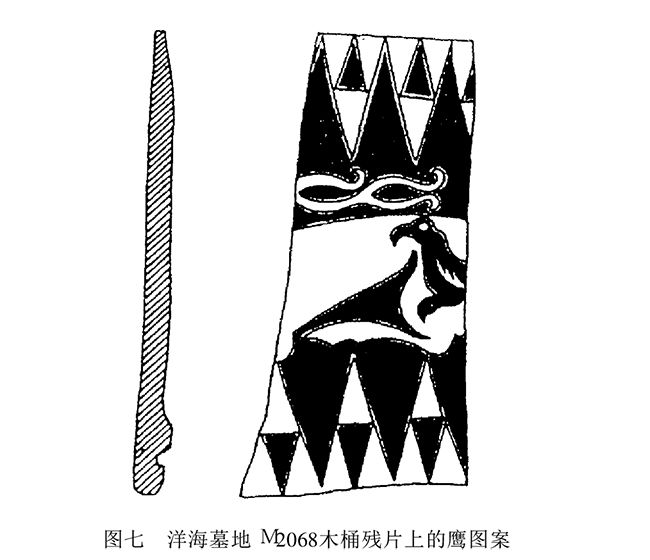 在洋海墓地的木桶上有一些动物纹样,刻划的动物有鹿、羊等食草动物,还有凶猛的大型食肉动物狼、虎等。最与本文讨论内容有关的是一件出自M2068的木桶,上下饰以黑白相间的三角纹,中间则是一个鸟,鸟仅存前半身,鹰嘴鹄目,特征非常明显(图七) ⑳。虽然木桶上的动物纹样,并非一定就是现实生活的真实再现,将雕刻者行为理解为某种传承或经验的结果,或许具有一定的道理。