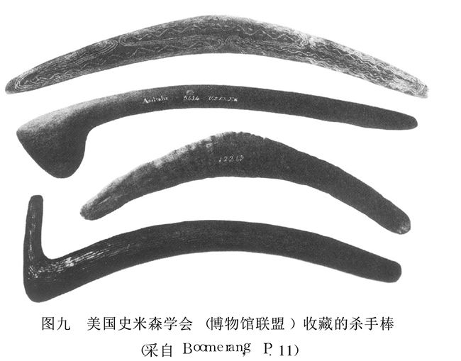 除去较早期的杀手棒(Killer-stick)(图九),飞去来器则朝双翼均衡的方向发展。由于杀手棒抛掷之后,也有向回飞行的功能,有的并不能回飞,它们都有同一个名称Bumerang。早期的殖民者所采用的这个词汇,来自已经消失了的新南威尔士(Wales)的Tharawl和Daruk部落的语言。这中间包含着可以返回与不可以返回的两种东西,很容易导致两者之间的混淆。据了解,在澳洲土著文化中它有数以三百计以上的名称21。南澳博物馆的人类学家NormanTindale博士根据他本人观察的经验,研究了飞去来器与杀手棒之间的区别22。