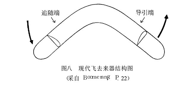 澳洲的飞去来器,两翼完全相等,表面光滑,外身圆润,呈弧度夹角,外侧基本呈弧形。角度方面并无太多的规限,从40°到120°的夹角都有。不过,以现在可以飞翔的飞去来器来看,有一个特征需引起注意,器表断面呈弧形,底部则平直,但一端刃部向内,另一端刃部则在外侧(图八)。刃部在内侧者称为导引端(Leading edge),刃部在外侧者称为追随端(Trailing edge)。依照空气动力学原理,飞行中刃部迎风面较小,弧形面有利于空气通过。