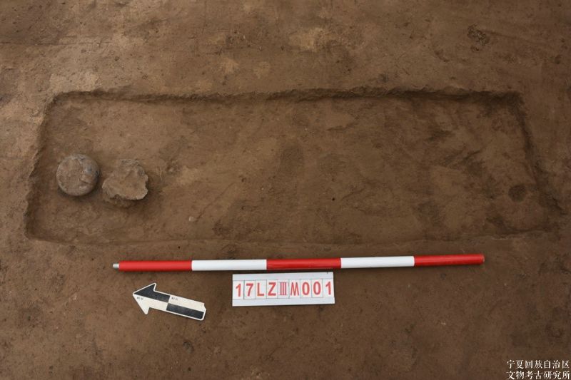 M001(图四)为南北向竖穴土圹墓,在墓室的北侧近发现有一头骨残块,其余骨骸不存,头骨北侧发现有一夹砂红陶罐。